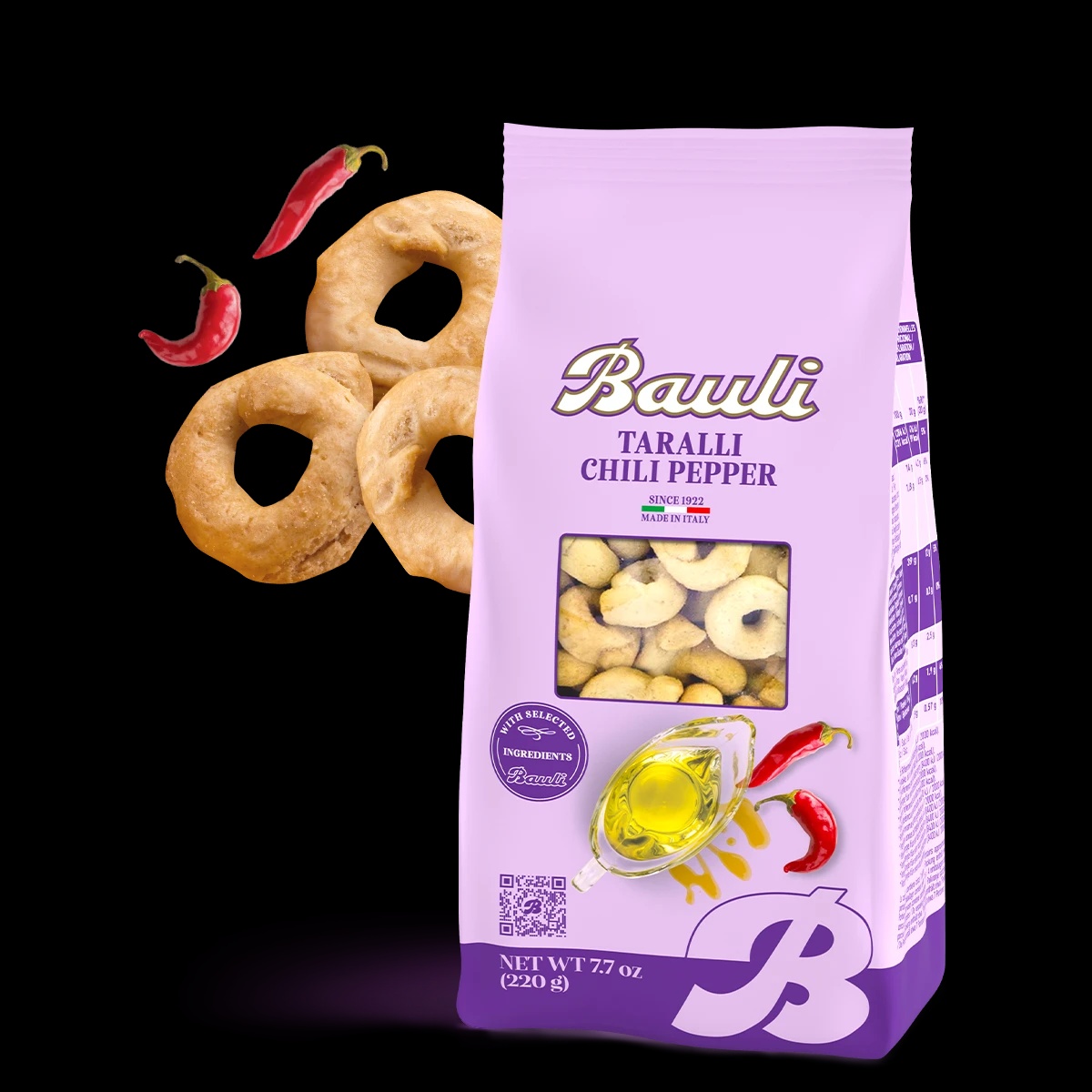 Chilli Pepper Taralli Bauli, crispy and with a strong flavour, with chilli pepper for an irresistible touch of spiciness. Ideal for those who love intense flavours, they are perfect for a tasty snack or to make your aperitif special.